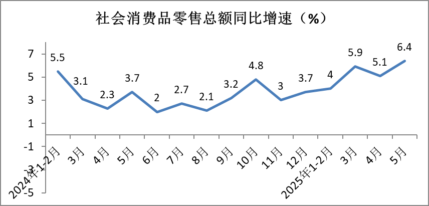 5月份,在消费品以旧换新政策持续发力、“五一”黄金周消费升温等利好因素的共同推动下,社会消费品零售总额41326亿元,同比增长6.4%,增速创2024年以来新高,较4月份加快1.3个百分点。1-5月份,社会消费品零售总额203171亿元,同比增长5%,增速较1-4月份加快0.3个百分点。