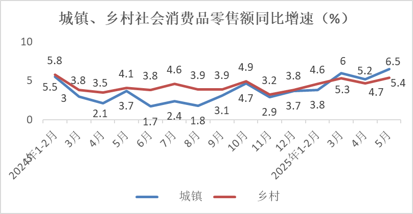 5月份,城镇消费品零售额36057亿元,同比增长6.5%,增速较4月份加快1.3个百分点;乡村消费品零售额5269亿元,同比增长5.4%,增速较4月份加快0.7个百分点。