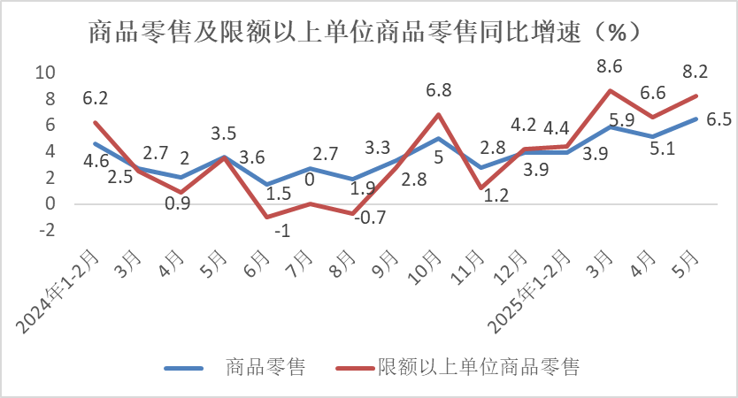 5月份,商品零售额36748亿元,同比增长6.5%,增速较4月份加快1.4个百分点。其中,限额以上单位商品零售额15342亿元,同比增长8.2%,增速较4月份加快1.6个百分点。限额以上单位商品零售额增速快于商品零售额增速1.7个百分点。