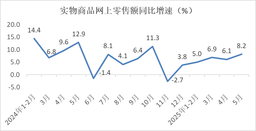 5月份,实物商品网上零售额同比增长8.2%,增速较4月份加快2.1个百分点。1-5月份,实物商品网上零售额49878亿元,增长6.3%,增速快于1-4月份0.5个百分点,占社会消费品零售总额的比重为24.5%,占比较1-4月份提高0.2个百分点。在1-5月份,实物商品网上零售额中,吃类、穿类、用类商品分别增长14.5%、1.2%、6.1%。