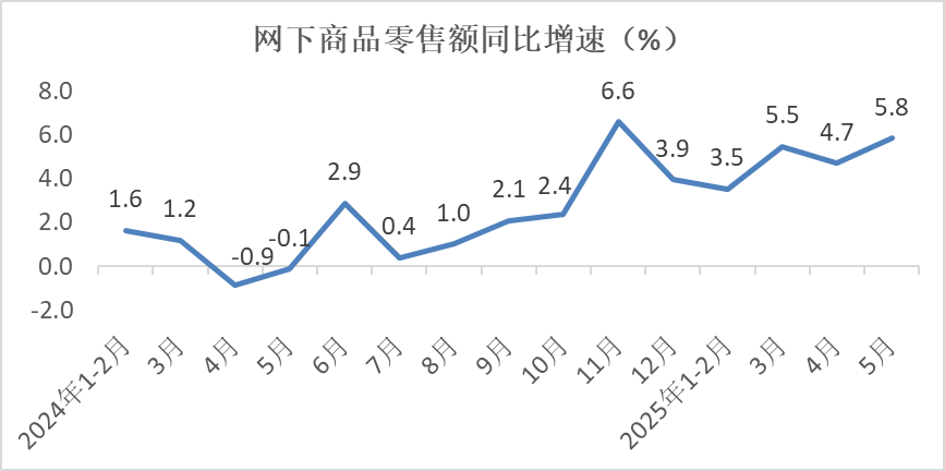 根据测算,5月份,网下商品零售额同比增长5.8%,增速较4月份加快1.1个百分点。1-5月份,网下商品零售额同比增长4.6%,增速较1-4月份加快0.3个百分点。