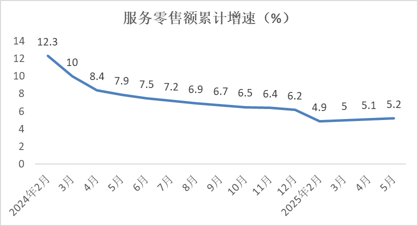在消费需求持续回暖,叠加“五一”长假旅游、文体、演出、娱乐等服务消费较快增长的带动下,1-5月份,服务零售额同比增长5.2%,增速较1-4月份加快0.1个百分点,连续三个月增速有所加快,且持续快于同期商品零售增速,呈现较好的增长势头。