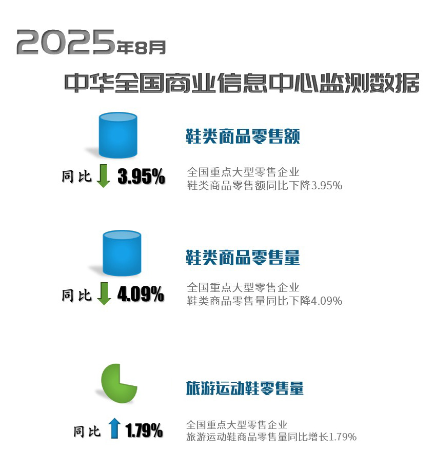 根据中华全国商业信息中心的监测数据,2025年8月份全国重点大型零售企业(以百货集团企业为主)鞋类零售额同比下降3.95%,零售量同比下降4.09%,其中旅游运动鞋零售量同比增长1.79%。