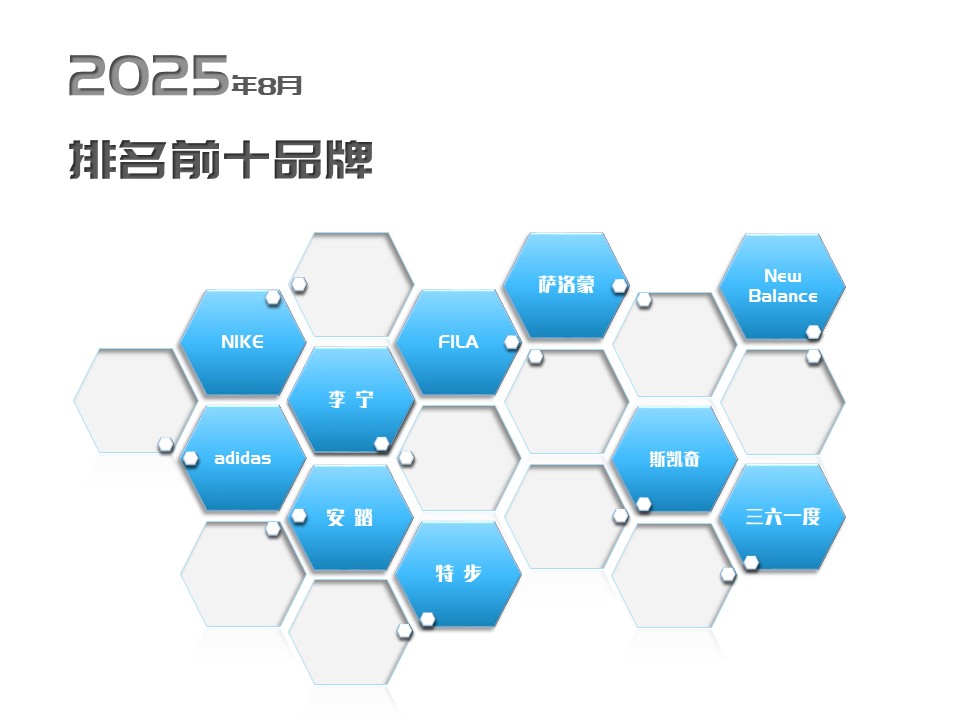 2025年8月份旅游运动鞋市场前十品牌市场综合占有率包括nike、李宁、adidas、安踏、斯凯奇、fila、new balance、萨洛蒙、特步、三六一度,这些品牌市场占有率合计为55.74%,同比下降2.29个百分点,环比提升1.29个百分点。