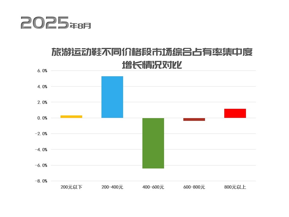 不同价格带品牌数量与市场占有率有所差异,中低端与高端价格带表现突出。具体来看,2025年8月旅游运动鞋市场中,中低端与高端价格带需求上升,200-400元大众价格带市场综合占有率较去年同期增长5.27个百分点稳居核心,800元以上高端市场综合占有率同比增长1.17个百分点,而400-600元中端区间市场综合占有率同比下滑6.40个百分点,反映出消费者或追求高性价比、或青睐高端功能与品牌价值的消费倾向。