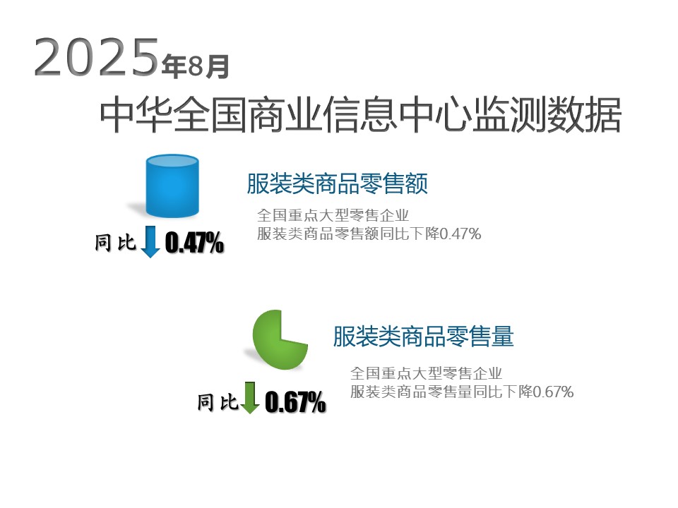 根据中华全国商业信息中心的监测数据,2025年8月份全国重点大型零售企业(以百货集团企业为主)服装类商品零售额同比下降0.47%,零售量同比下降0.67%。运动服类商品零售量同比下降0.71%。