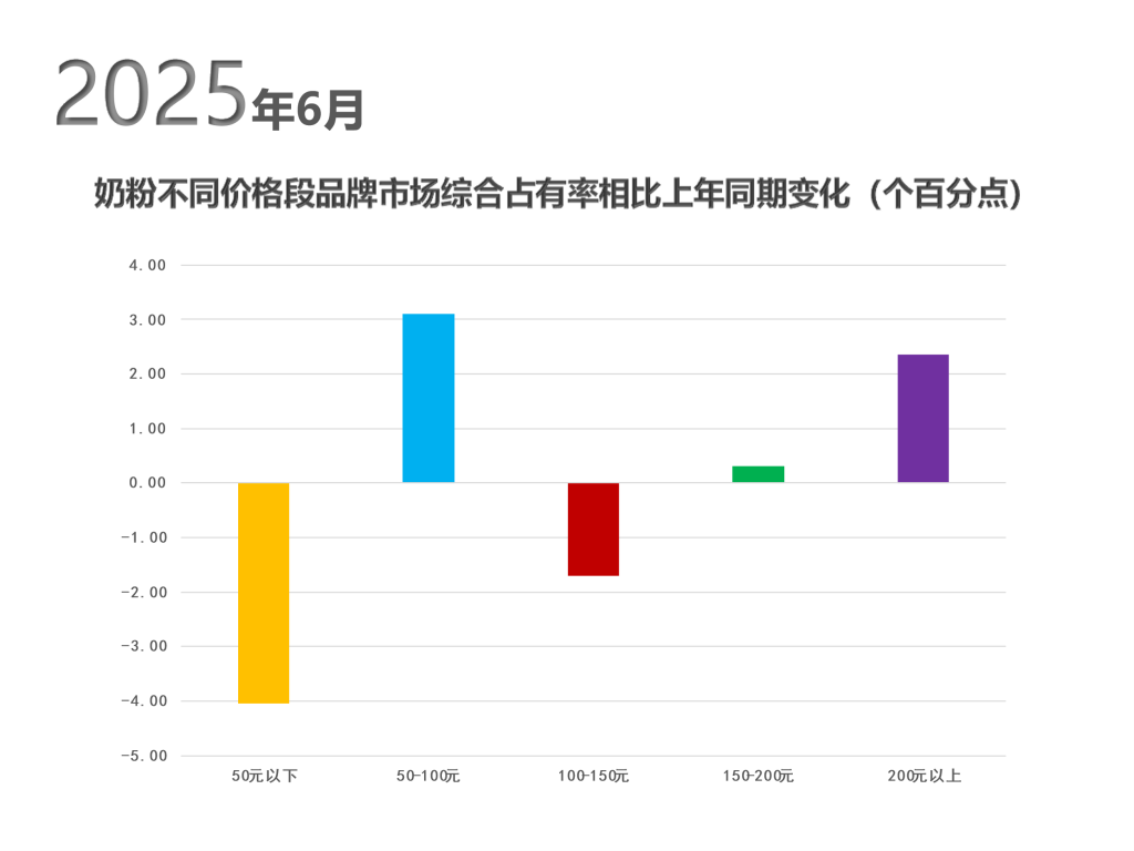 从6月份品牌数据来看,在监测范围内奶粉类商品零售平均价格为78.1元,与去年同期相比有所上涨。其中,终端销售均价在50-100元、150-200元以及200元以上的品牌市场综合占有率均有不同程度的提高,均价在50-100元的品牌市场综合占有率相较于上年同期提升最为明显,上升了3.10个百分点。