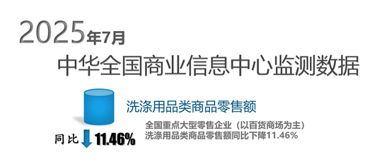 根据中华全国商业信息中心的监测数据,2025年7月份全国重点大型零售企业(以百货商场为主)洗涤用品类商品零售额同比下降11.46%。