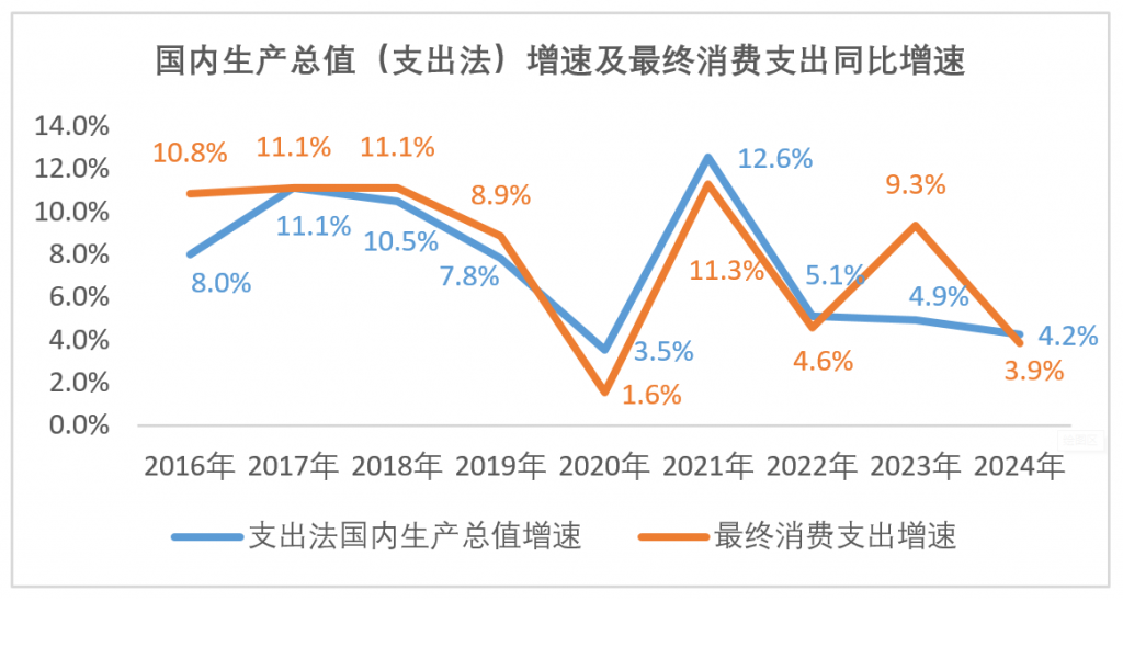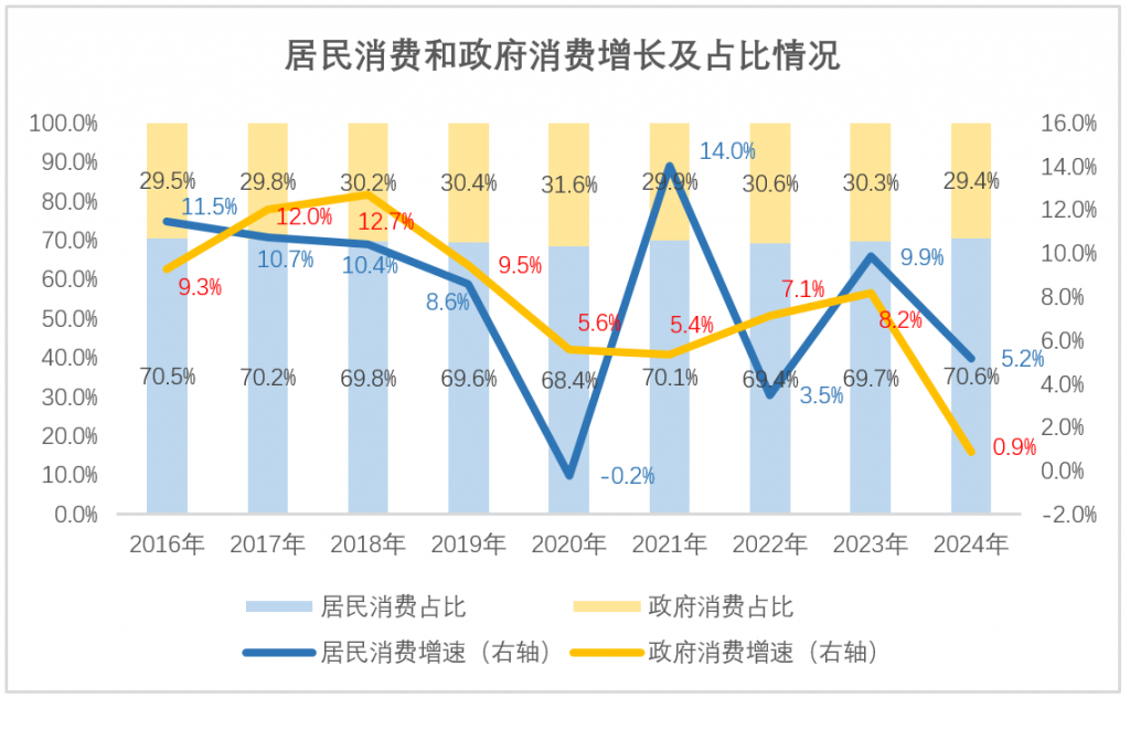 1、居民消费支出占比提升。2024年,居民消费支出较2020年增长36.4%,增幅远超政府消费支出13.2个百分点。2021年至2024年,居民消费支出年均增长8.1%,增速与“十三五”时期基本持平,快于政府消费支出年均增速2.7个百分点。2024年,居民消费稳定增长与政府消费增速较快放缓使得最终消费支出中的居民消费支出占比得到提升,最终消费支出中的居民消费占比达到70.6%,创“十三五”时期以来的最高水平。总体来看,疫情后居民消费支出意愿恢复较快。