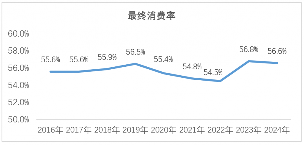 2、最终消费率超过疫情前水平。2021年至2024年,最终消费率平均值为55.7%,与“十三五”时期基本持平。其中,2023年、2024年,最终消费率达到56.8%、56.6%,均超过疫情前2019年水平,消费的经济增长稳定器作用进一步凸显。
