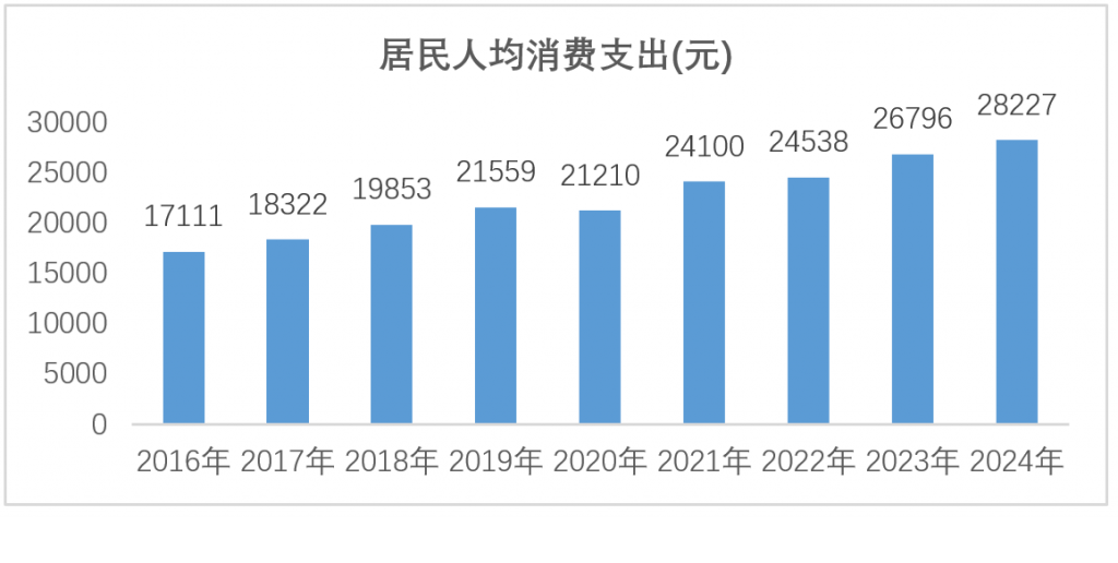 3、居民消费支出稳步提升。2024年,我国居民人均消费支出28227元,较2020年增加7017元,增幅达到33.1%。2021-2024年,居民人均消费支出持续增长,年均增速为7.4%,较“十三五”时期年均增速加快1.2个百分点。
