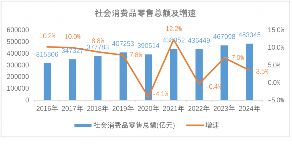 4、消费品市场规模体量更大。2024年,我国社会消费品零售总额实现483345亿元,较2020年大幅增长23.8%。2021年至2024年,社会消费品零售总额年均增速为5.5%,市场规模年均增长23208亿元。如果2025年社会消费品零售总额同比增长5%,则消费品市场规模将超过500000亿元,“十四五”时期年均约增长23400亿元,相当于每年增加一个福建省的消费品市场规模。