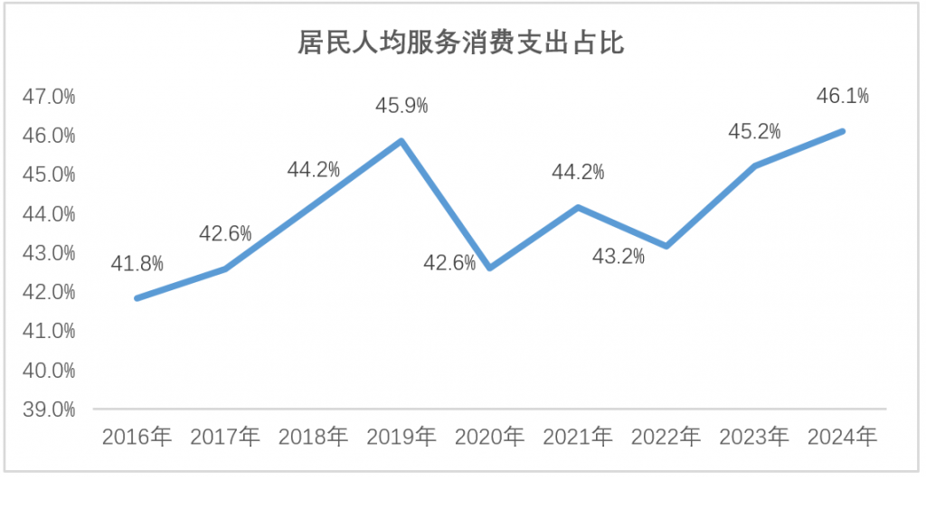 2、居民服务消费占比超过疫情前水平。2021年至2024年,居民人均服务消费支出年均增长9.6%,增速快于“十三五”时期2.7个百分点。2024年,居民人均服务消费支出占居民人均消费支出比重达到46.1%,较“十三五”时期末提高3.5个百分点,并超过疫情前2019年占比水平。
