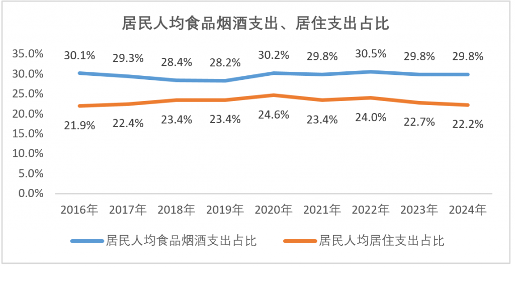 3、恩格尔系数降中趋稳。在偏刚性的消费需求中,居民食品消费基本保持平稳增长,但人们在旅游、运动、教育、娱乐等服务相关的升级类消费支出增长更快,使得从消费占比角度来看,我国居民人均食品烟酒支出占比(即恩格尔系数)平稳降至29.8%。此外,在房租下降、物业、水电、燃气等住房费用基本平稳、服务消费占比提升等因素的影响下,居民人均居住支出占比在2021年至2024年间呈现下降态势,2024年占比为22.2%,较2020年下降2.4个百分点。