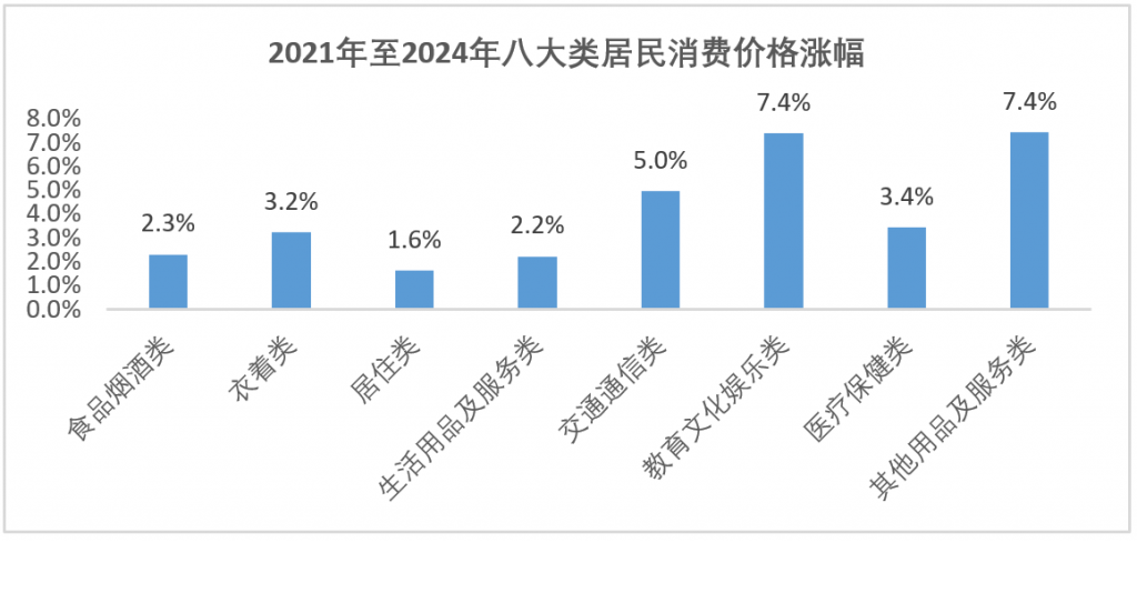 5、服务类消费价格涨幅较快。旺盛的服务消费需求推动相关价格较快上涨。2021年至2024年,我国居民消费价格较2020年累计上涨3.3%。八大类居民消费价格中,教育文化娱乐类价格上涨7.4%、其他用品及服务类价格上涨7.4%、交通通信类价格上涨5%、医疗保健类价格上涨3.4%,均超过居民消费价格涨幅。