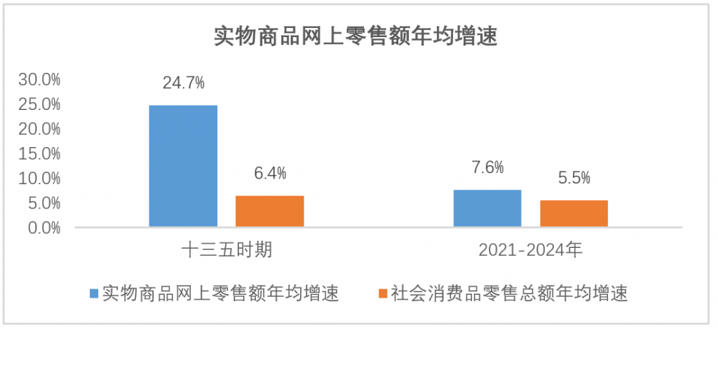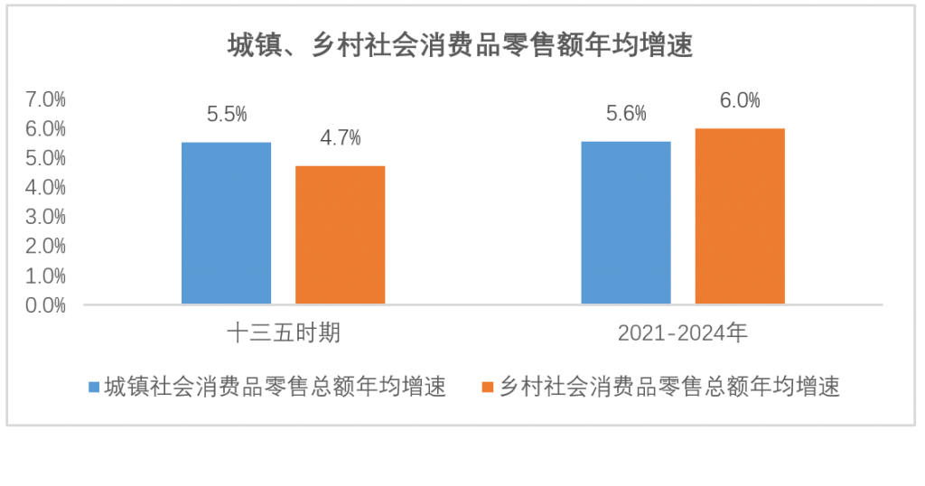 6、乡村消费品市场实现较快增长。在乡村全面振兴、县域商业体系建设、汽车家电下乡等政策的推动下,我国县、乡、村商贸流通体系逐步建立、县域商业基础设施不断完善、工业品下乡和农产品进城渠道更加畅通,农民增收与农民消费提质扩容呈现良性循环,乡村消费品市场规模实现较快增长。2021年至2024年,乡村社会消费品零售总额年均增长6%,增速快于城镇0.4个百分点,快于“十三五”时期乡村增速1.3个百分点。