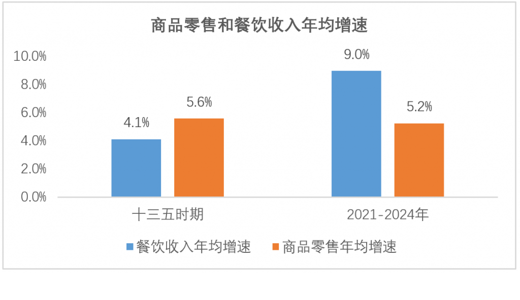 7、餐饮消费恢复速度较快。随着社会经济持续回升向好,促消费政策持续发力,居民外出聚餐意愿显著提升,加之餐饮企业大力践行数字化、品质化、健康化、绿色化转型,共同推动餐饮市场实现快速复苏。2021年至2024年,餐饮收入年均增长9%,增速快于商品零售3.8个百分点,快于“十三五”时期餐饮收入平均增速4.9个百分点。