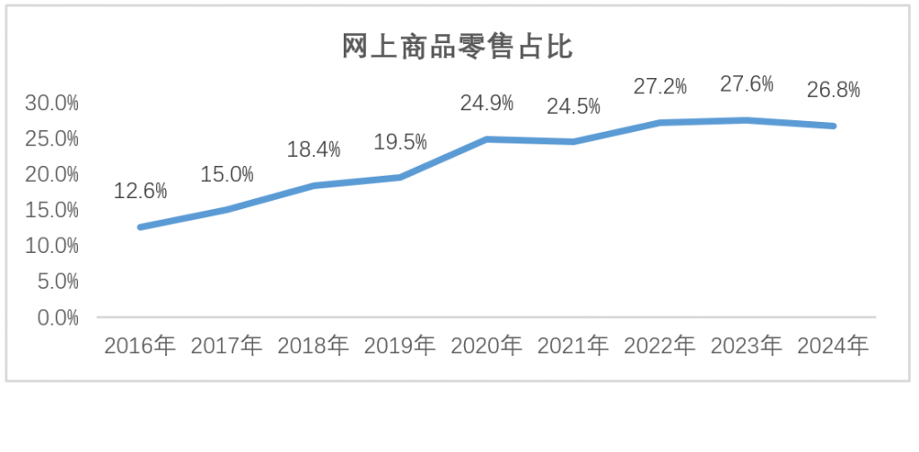 8、网上消费占比趋于稳定。疫情时期,实体店消费深受影响,得益于近年来我国网上购物、移动支付、直播平台等新业态、新模式迅速发展,新型消费在此期间发挥了重要的保民生作用,也为疫情后国内消费恢复奠定坚实基础。2021年至2024年,实物商品网上零售额年均增长7.6%,增速快于社会消费品零售总额年均增速2.1个百分点。随着网上消费市场不断扩大,发展新型消费的重点从规模扩张转向提升品质、加强创新、规范监管、优化环境。《国务院办公厅关于以新业态新模式引领新型消费加快发展的意见》明确提出,经过3-5年努力,促进新型消费发展的体制机制和政策体系更加完善,通过进一步优化新业态新模式引领新型消费发展的环境、进一步提升新型消费产品的供给质量、进一步增强新型消费对扩内需稳就业的支撑。2022年后,我国实物商品网上零售额占社会消费品零售总额的比重较“十三五”时期明显趋稳,基本保持在27%左右的水平。