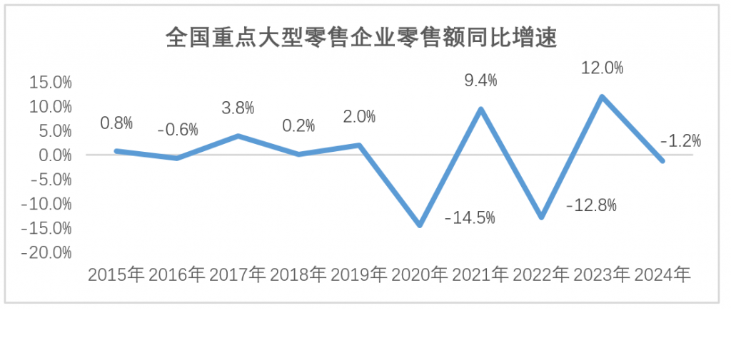 9、大型零售企业经营状况趋于稳定。由于大型零售企业发展历史较长,经营稳定,且居民消费具有惯性,所以疫情前的“十三五”时期,全国重点大型零售企业零售额增幅(降幅)较为平缓。2020年后,在疫情冲击和增速基数影响下,大型零售企业业绩波动较大,给企业经营和市场预测带来巨大挑战。随着社会秩序逐步回归常态,大型零售企业经营状况也呈现稳中有升的发展趋势。根据中华全国商业信息中心统计,2024年全国重点大型零售企业零售额同比下降1.2%,降幅低于限额以上单位百货店降幅1.2个百分点,零售额较上年的变化幅度明显小于2020年至2023年,表明重点大型零售企业销售趋于稳定。