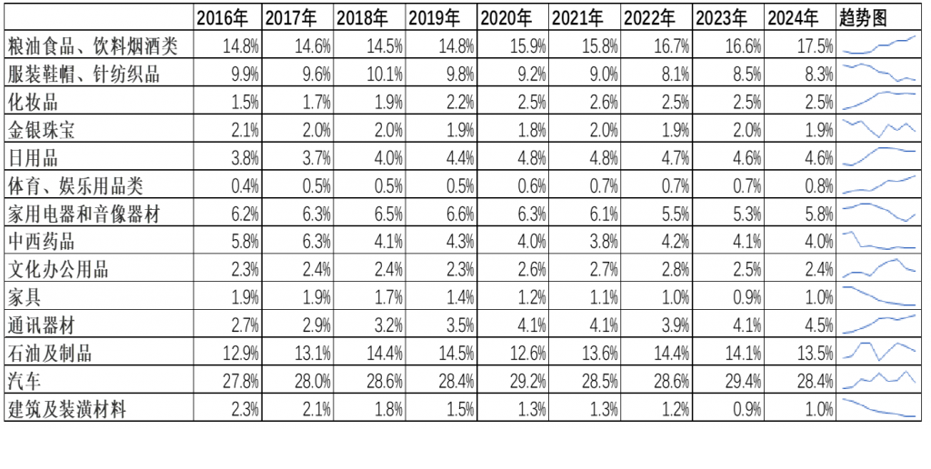 10、品质感、体验感、科技感丰富的商品销售占比提升。从限额以上单位各类商品零售占比情况来看,生活品质感最为直观的粮油食品、饮料烟酒类、能够带来快乐、健康、成就感等丰富体验的体育、娱乐用品类、以及融合数字科技、信息技术等现代元素的通讯器材类零售占比均呈现持续稳定的上升;部分传统的百货超市类商品,如化妆品类、日用品类、中西药品类零售占比较为平稳;与价格密切相关的石油及制品类、金银珠宝类零售占比则呈现较为明显的波动;与住房相关的家具类、建筑及装潢材料类零售占比则呈现下降趋势,其中,在以旧换新政策推动下,家用电器和音响器材类零售占比有所回升。