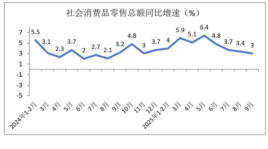 2025年前三季度,以旧换新等提振消费系列政策措施落地见效,市场活力增强,消费潜力释放,消费市场实现稳定增长,社会消费品零售总额实现365877亿元,同比增长4.5%,增速比上年同期、上年全年分别加快1.2个、1.0个百分点。9月份,社会消费品零售总额增长3.0%,受中秋节错月节假日减少等因素影响,增速比8月份回落0.4个百分点,扣除价格因素,实际增长3.5%。