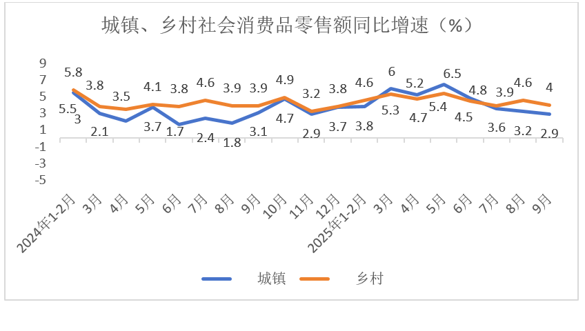 9月份,城镇消费品零售额为35783亿元,同比增长2.9%,增速较8月份回落0.3个百分点;乡村消费品零售额为6188亿元,同比增长4.0%,增速比8月份回落0.6个百分点,乡村市场销售增速持续快于城镇。