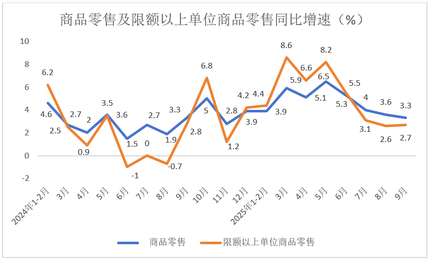 9月份,商品零售额37462亿元,同比增长3.3%,增速较8月份回落0.3个百分点。其中,限额以上单位商品零售额16429亿元,同比增长2.7%,增速较8月份加快0.1个百分点。