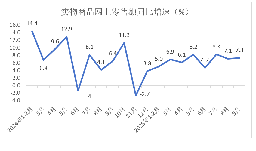 前三季度,实物商品网上零售额91528亿元,同比增长6.5%,增速相较于上半年加快0.5个百分点,占社会消费品零售总额的比重为25.0%,占比较上半年提高了0.1个百分点。在实物商品网上零售额中,吃类、穿类、用类商品分别增长15.1%、2.8%、5.7%。9月份,实物商品网上零售额同比增长7.3%,增速较8月份加快0.2个百分点。