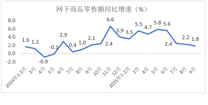 根据测算,前三季度,网下商品零售额同比增长3.9%,增速较上半年放缓0.9个百分点。其中,9月份,网下商品零售额同比增长1.8%,增速较8月份放缓0.4个百分点。