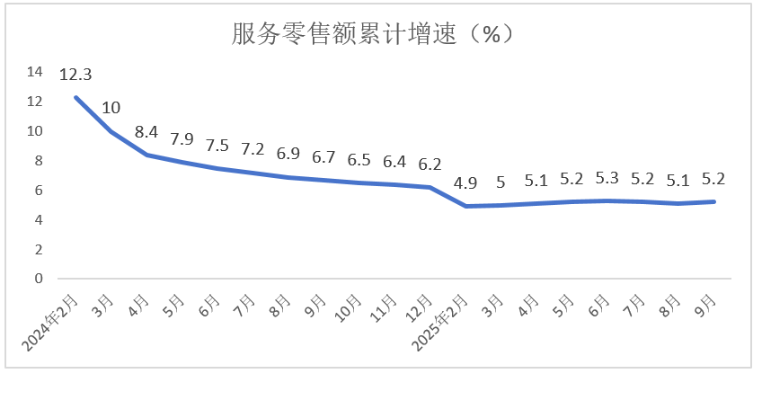 在扩大服务消费系列政策措施带动下,服务消费需求加速释放,前三季度,服务零售额同比增长5.2%,增速比1—8月份加快0.1个百分点,高于同期商品零售额0.6个百分点。其中,文体休闲服务类、通讯信息服务类、旅游咨询租赁服务类、交通出行服务类零售额实现两位数增长。国铁集团数据显示,2025年前三季度,全国铁路发送旅客35.4亿人次,同比增长6%,再创历史同期新高。国家电影局数据显示,前三季度,全国电影票房收入同比增长20.7%。工业和信息化部数据显示,1—8月份,全国软件业务收入增长12.6%。