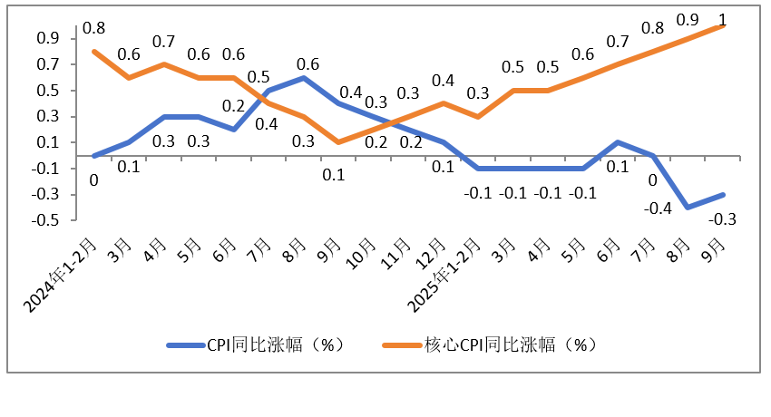 前三季度,消费领域价格运行总体平稳,主要受食品价格有所扩大以及能源价格处于低位因素影响,cpi比上年同期下降0.1%。9月份cpi同比下降0.3%,降幅相比上月收窄0.1个百分点。随着扩内需促消费政策持续显效,扣除食品和能源价格的核心cpi前三季度同比上涨0.6%,涨幅比上半年扩大0.2个百分点,其中9月份涨幅回升至1%。